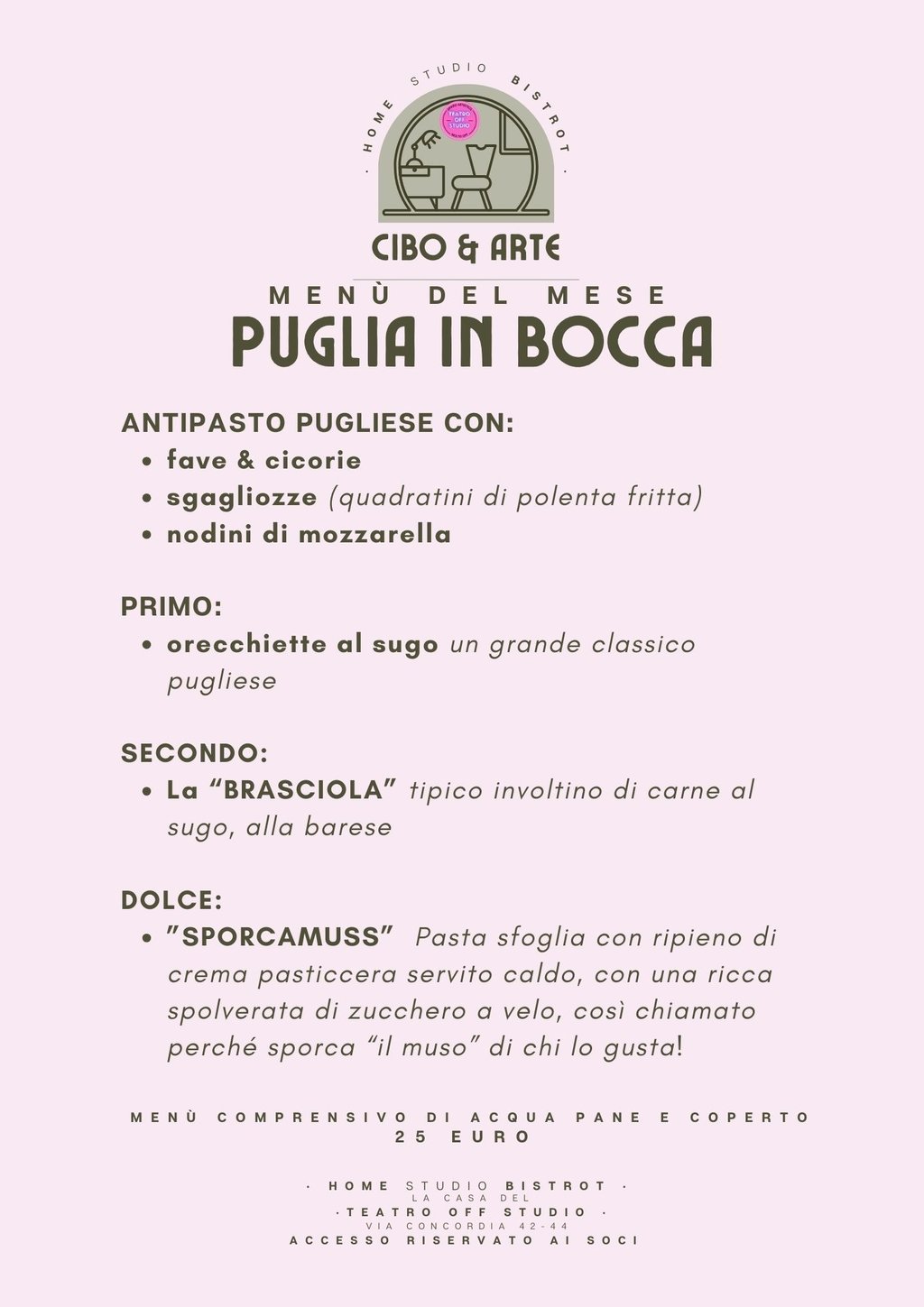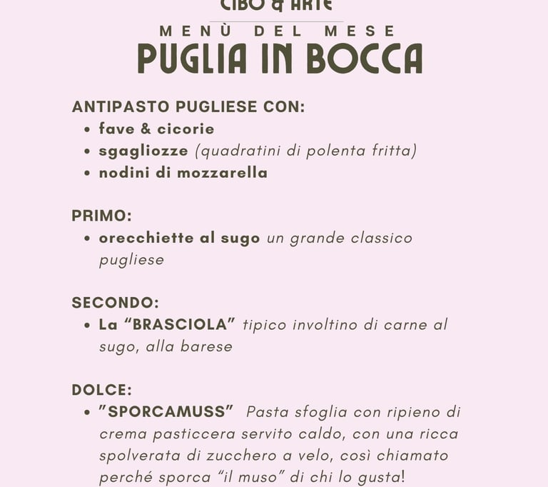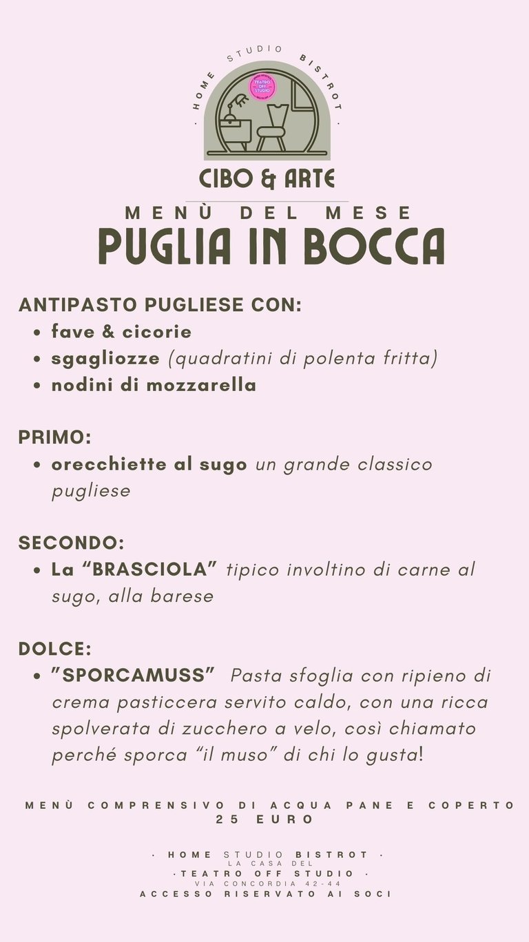 "Un menù dedicato alla cucina pugliese. Non il solito ristorante, ma un vero e proprio home bistrot all'interno di uno spazio artistico..."